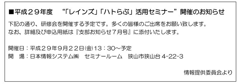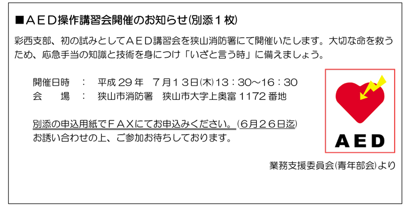 ※ご意見・ご希望等ございましたら 彩西支部事務局(柴田・山下)までご連絡ください。 Tel 04-2969-6060 Fax 04-2969-6075 (受付時間 月・火・木・金曜日 午前10時〜午後4時)