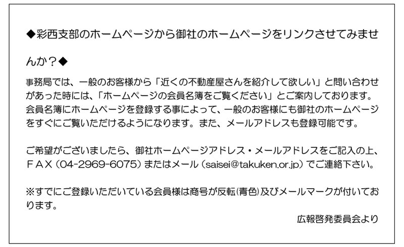 公益社団法人埼玉県宅地建物取引業協会/彩西支部ホーム ごあいさつ 支部紹介 無料相談 研修会 組織・役員 会員名簿 支部お知らせ「彩西だより」 リンク集