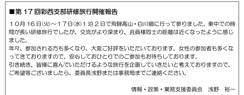 ※ご意見・ご希望等ございましたら 彩西支部事務局(柴田・山下)までご連絡ください。