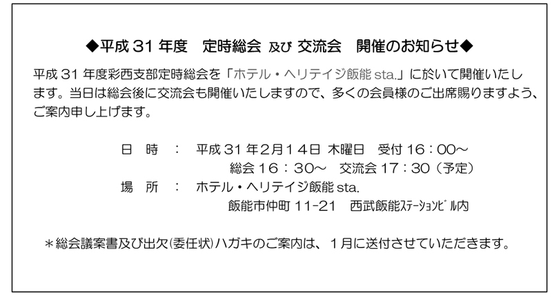 ※ご意見・ご希望等ございましたら 彩西支部事務局(柴田・山下)までご連絡ください。