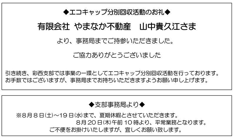 ※ご意見・ご希望等ございましたら 彩西支部事務局(柴田・山下)までご連絡ください。