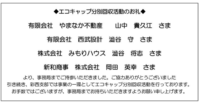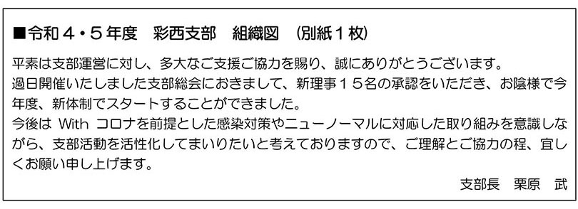 ※ご意見・ご希望等ございましたら 彩西支部事務局(柴田・山下)までご連絡ください。