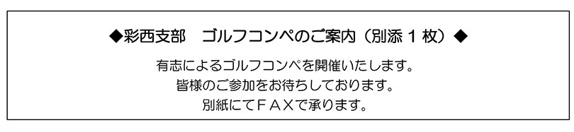 ※ご意見・ご希望等ございましたら 彩西支部事務局(柴田・山下)までご連絡ください。 Tel 04-2969-6060 Fax 04-2969-6075 (受付時間 月・火・木・金曜日 午前10時〜午後4時)
