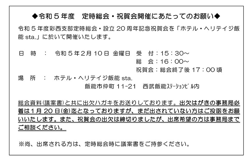 ※ご意見・ご希望等ございましたら 彩西支部事務局(柴田・山下)までご連絡ください。 Tel 04-2969-6060 Fax 04-2969-6075 (受付時間 月・火・木・金曜日 午前10時〜午後4時)