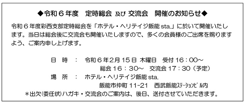 ※ご意見・ご希望等ございましたら 彩西支部事務局(柴田・山下)までご連絡ください。