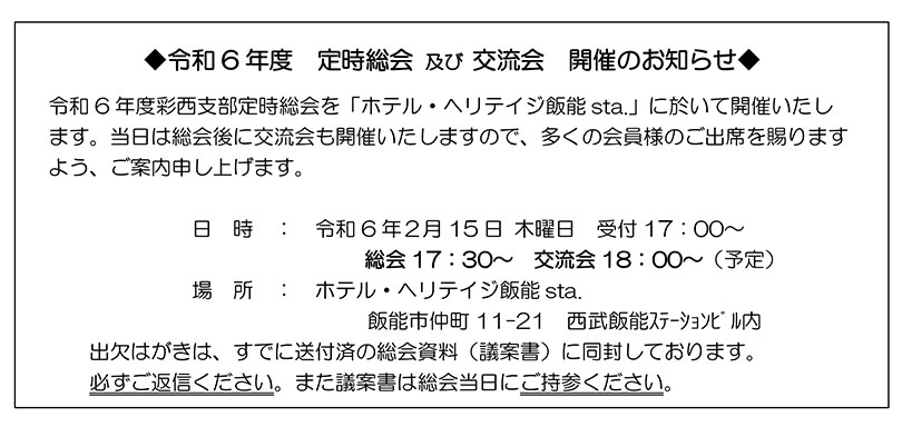 ※ご意見・ご希望等ございましたら 彩西支部事務局(柴田・山下)までご連絡ください。 Tel 04-2969-6060 Fax 04-2969-6075 (受付時間 月・火・木・金曜日 午前10時〜午後4時)