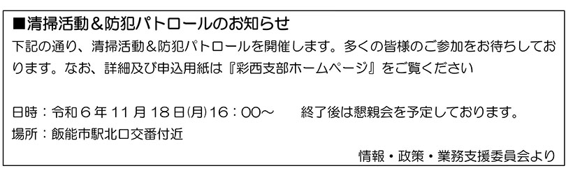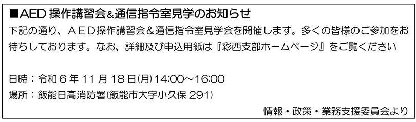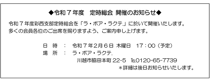 ※ご意見・ご希望等ございましたら 彩西支部事務局(柴田・山下)までご連絡ください。 Tel 04-2969-6060 Fax 04-2969-6075 (受付時間 月・火・木・金曜日 午前10時〜午後4時)