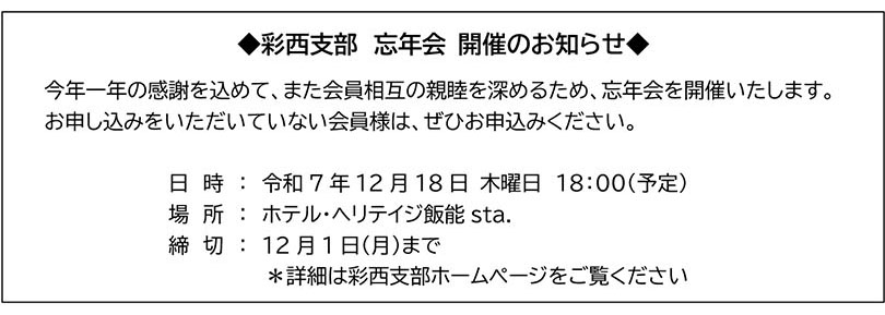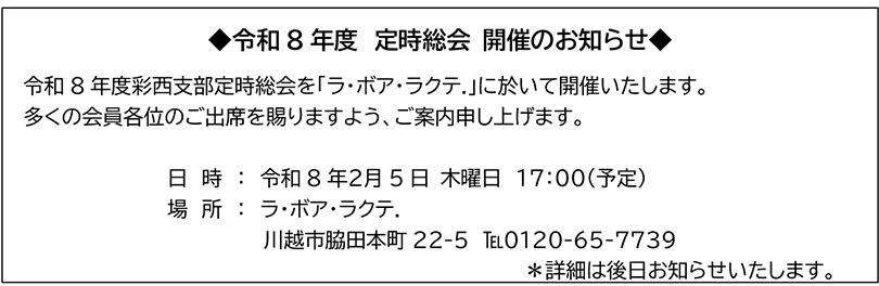 ※ご意見・ご希望等ございましたら 彩西支部事務局(柴田・山下)までご連絡ください。
