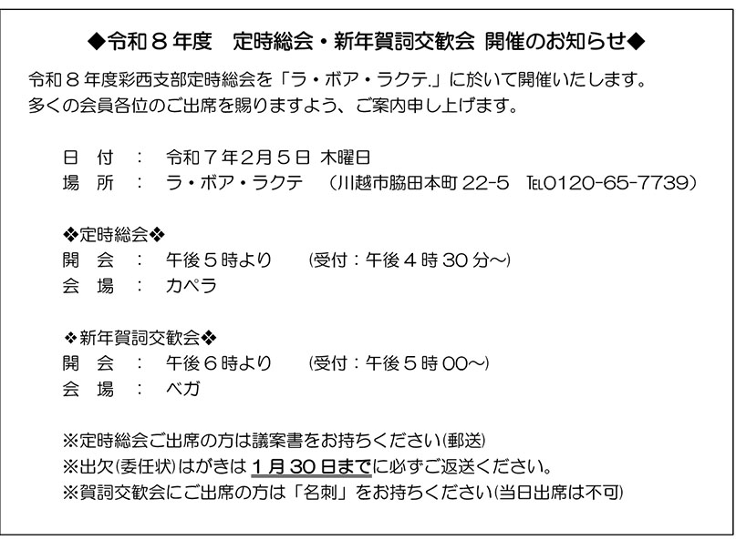 ※ご意見・ご希望等ございましたら 彩西支部事務局(柴田・山下)までご連絡ください。 Tel 04-2969-6060 Fax 04-2969-6075 (受付時間 月・火・木・金曜日 午前10時〜午後4時)