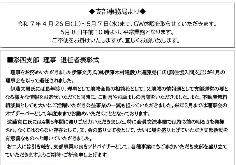 公益社団法人 埼玉県宅地建物取引業協会「彩西支部からのお知らせ」2025年5月号(2) PDFでもご覧いただけます