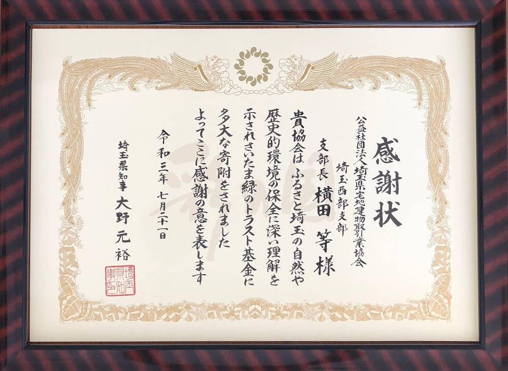 令和3年7月21日に、「さいたま緑のトラスト基金」への寄附に対する感謝状を受賞いたしました。